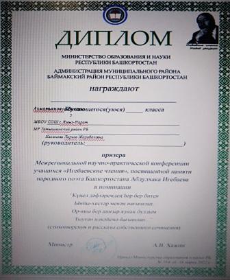 Обучающаяся 5 класса, Ахматьянова Камелия, стала призером Межрегиональной научно-практической конференции "Игебаевские чтения", посвященной памяти народного поэта Башкортостана Абдулхака Игебаева в номинации "Кунел дэфтэремден...". Руководителем является учитель родного языка и литературы Хасанова Лариза Жорабековна.